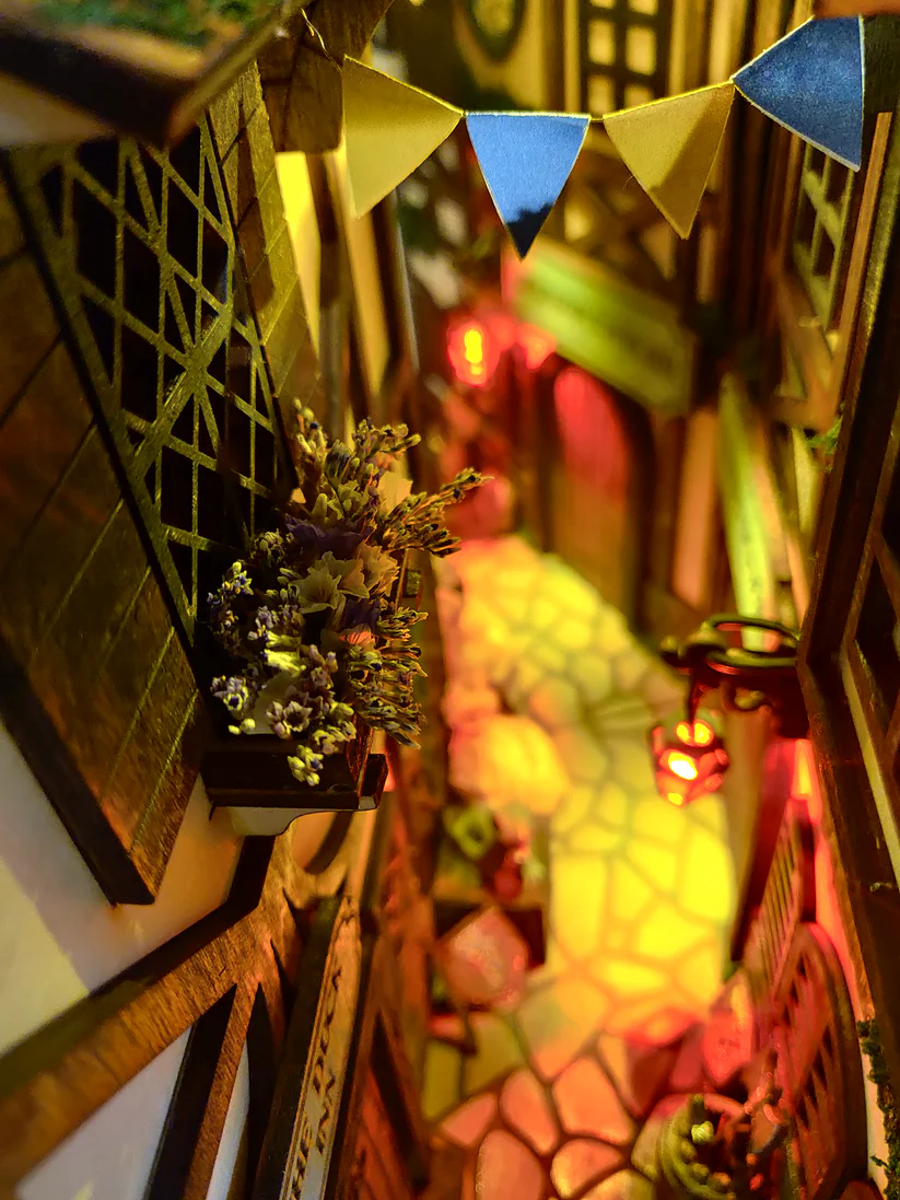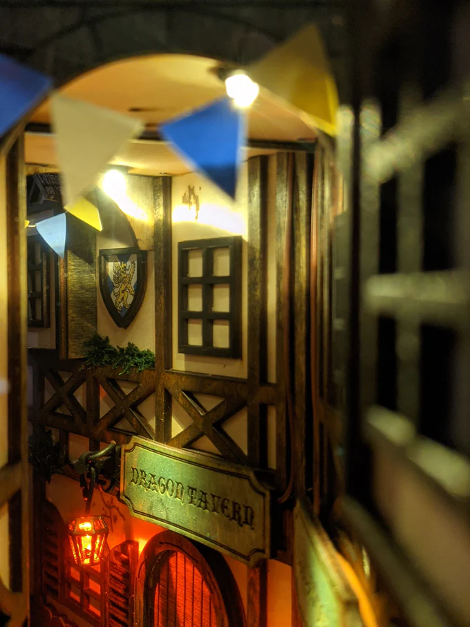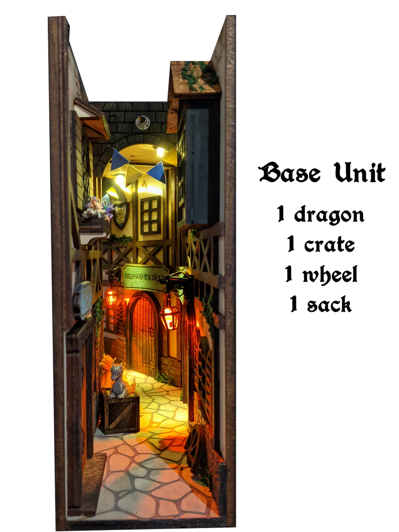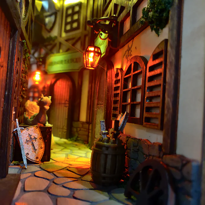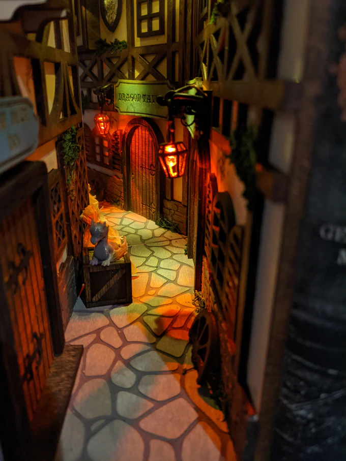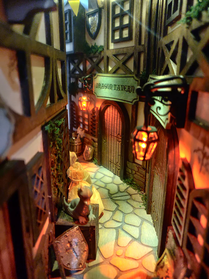 The Medieval miniAlley is a high-quality, custom handmade bookshelf insert/booknook that captures a charming and cozy medieval alleyway. Imagine yourself strolling through this very alley during a breezy summer night, browsing various weapons and shields through the variety of shop windows, playing with the cute little dragon, or walking into the tavern to enjoy a couple of drinks with your friends.