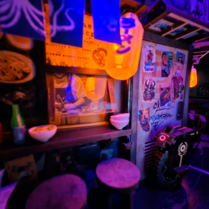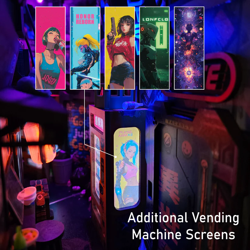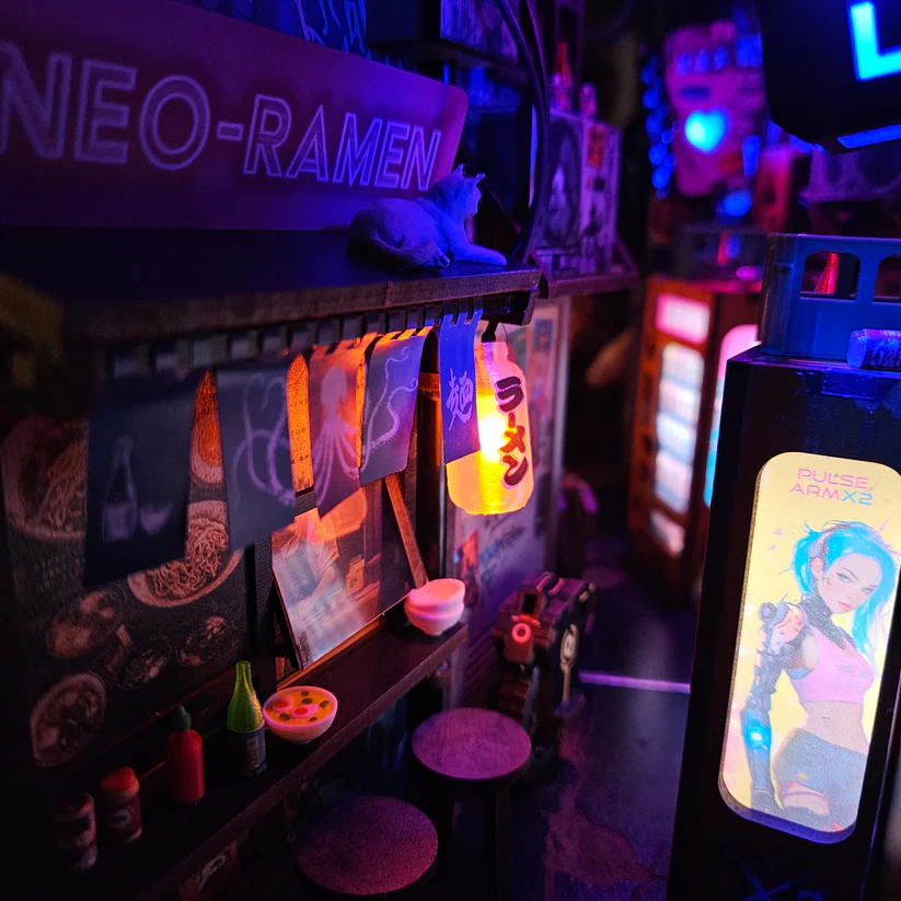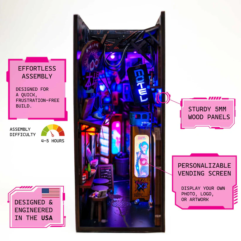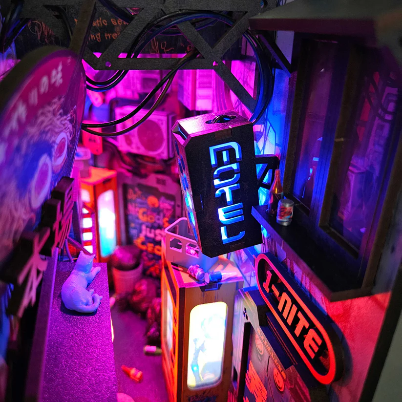 A DIY cyberpunk booknook diorama, designed for collectors, model enthusiasts, and sci-fi fans. Designed in the USA and crafted with precision engineering, premium materials, and easy plug-and-play assembly, it’s more than a display—it’s an immersive world waiting to be built.